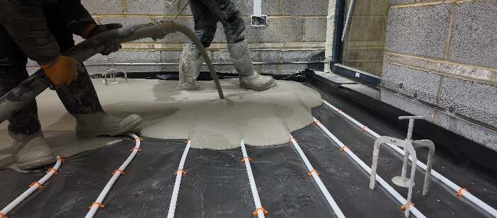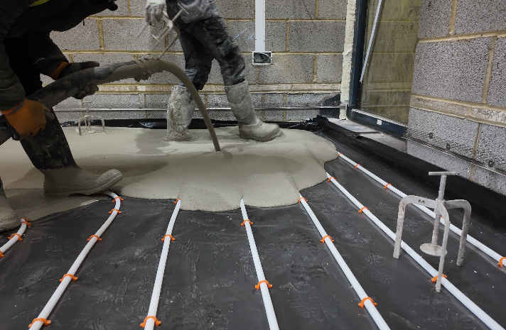 Flowing screed fully encapsulates heating pipes, eliminating air pockets and maximising thermal conductivity.